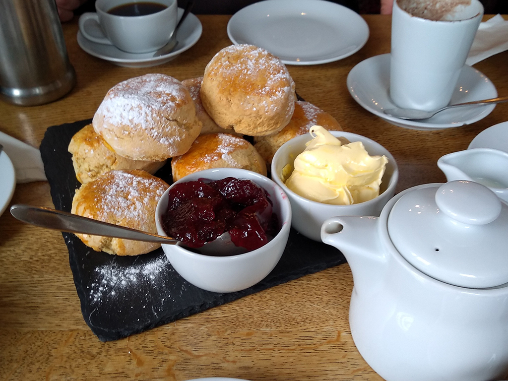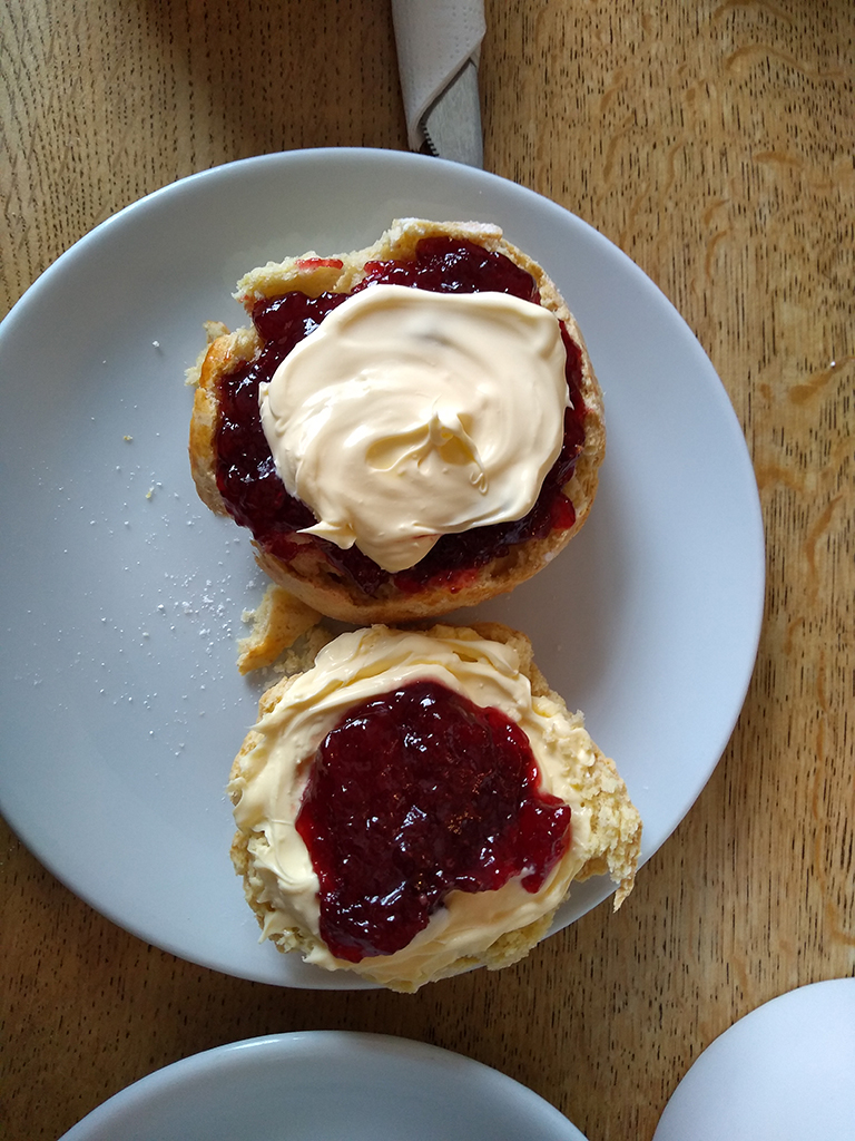 According to those from Devon, the “proper” way to have Cream Tea is to split the scone in two, spread the cream first and then put the jam on top. The Cornish way is to put the jam on first and then spoon the cream on top. Ruth is a proponent of the Devonshire method while Darren prefers the Cornish method.