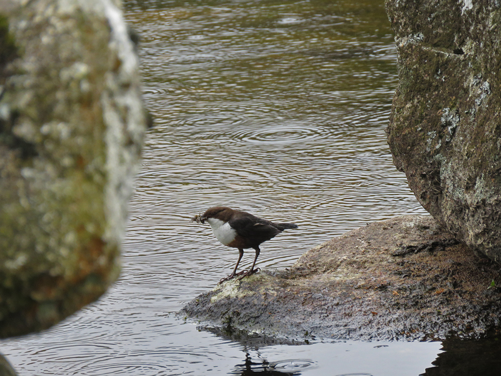 A dipper foraging beneath the clapper bridge. You can just see the long grappling claws it uses to keep anchored to rocks, especially under water.