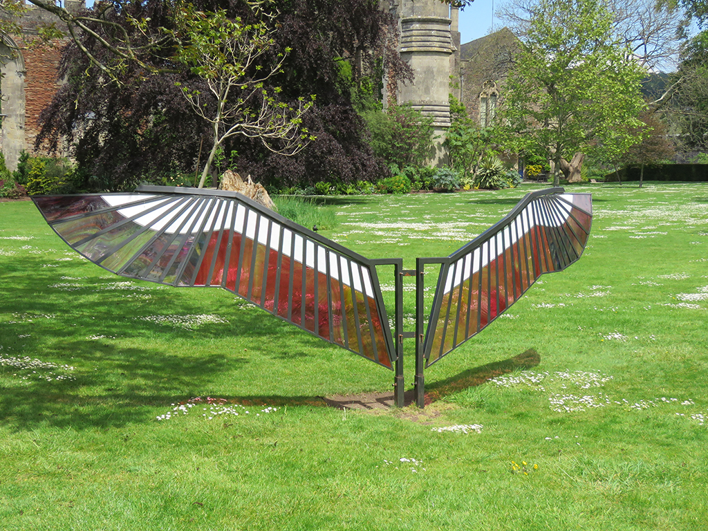Colored glass sculpture shaped like bird wings.