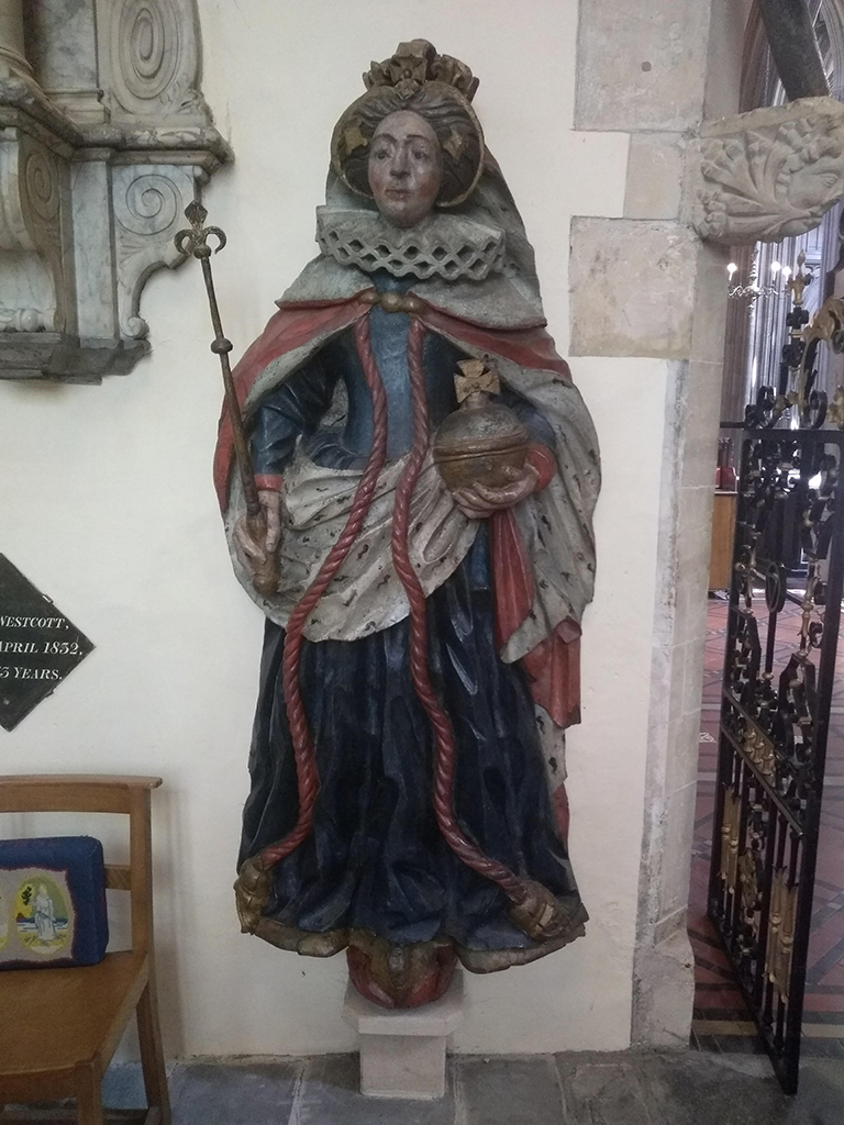 There is also a wooden carving of Queen Elizabeth I, dating from her reign (likely circa 1570). She is known to have visited the church in 1574, but I don’t know if the carving was already there, or done later to commemorate her visit. It is remarkably well preserved, though I suspect the paint’s been touched up now and then.