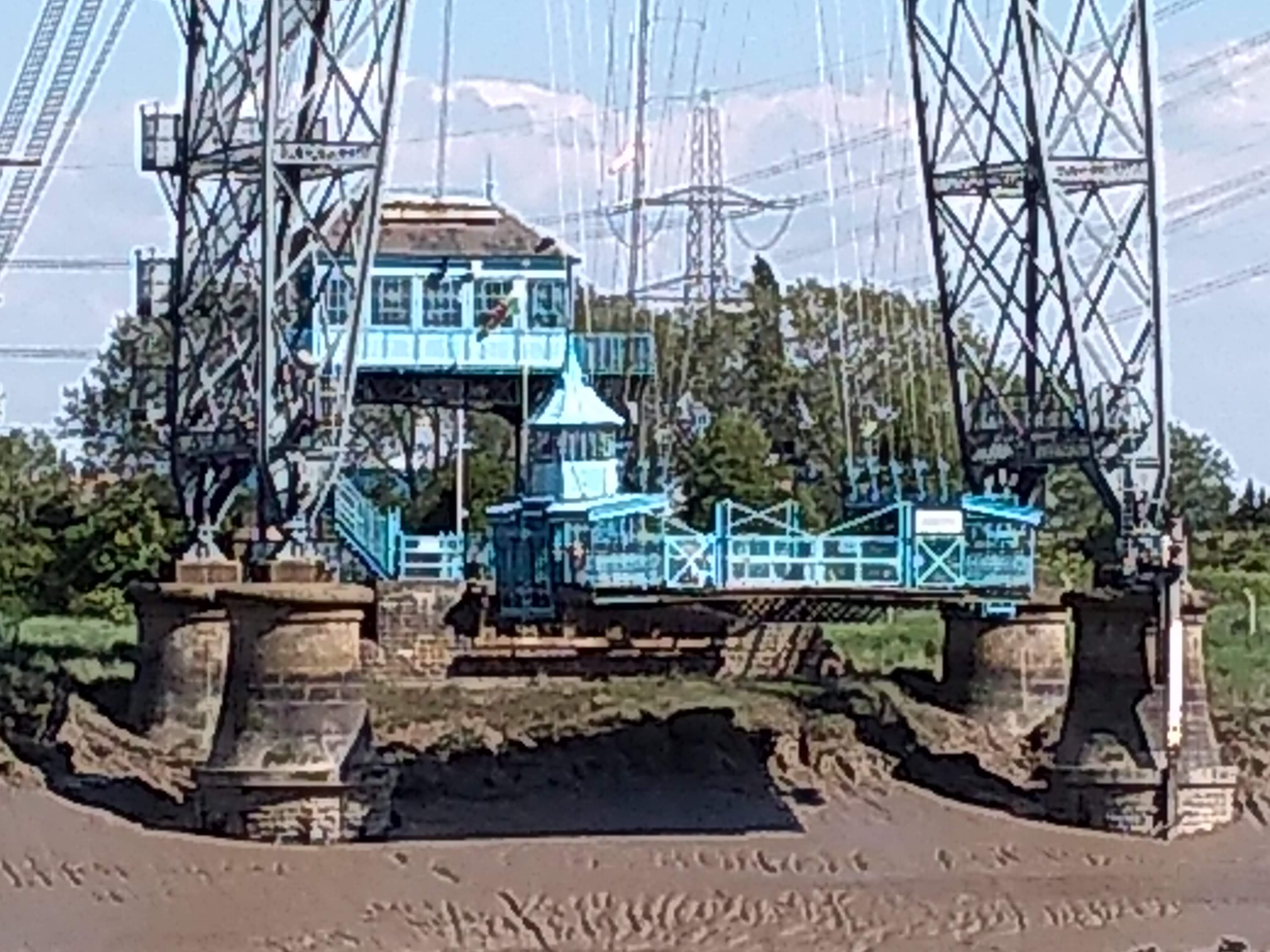 A view of the transporter bridge. The gondola is the light teal object near the bottom of the tower on the left.