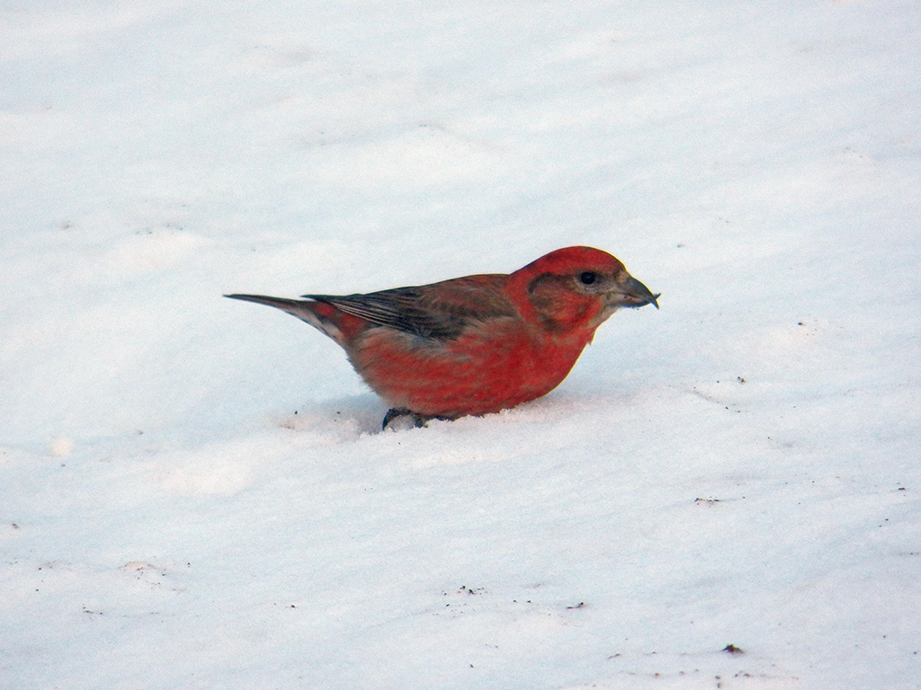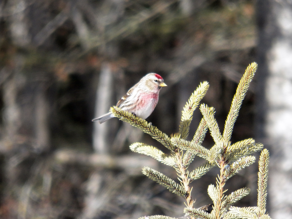 We had some Hoary Redpolls mixed in as well. It’s hard to tell a Hoary Redpoll from a Common Redpoll at a distance, and we had thought we’d seen a few prior to Sunday, but we finally got some good looks at a few this time. Many of the birds along the roadside were feeding, not on seeds but on pieces of grit and gravel. Birds have no teeth and cannot grind the relatively tough seeds they eat without some help. They ingest grit which works to break down the seeds for digestion. For some birds, they even derive minerals they need from the grit breaking down. The plowed roadsides we were driving past were ideal grit sources as the plows and vehicles kick up ground up stone and gravel onto the snow banks.