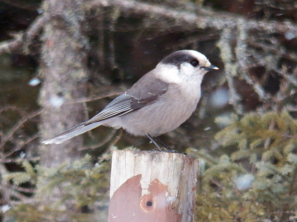 I had my first Gray Jays at the same feeder station where we were hoping for Boreal Chickadees. The jays love peanut butter and were stuffing it by the beak-full. Peanut butter is a good winter food at feeding stations in winter. It has a good amount of protein and fat, and the cold temperatures keep it from going rancid too quickly (although in really cold weather it will eventually freeze).
