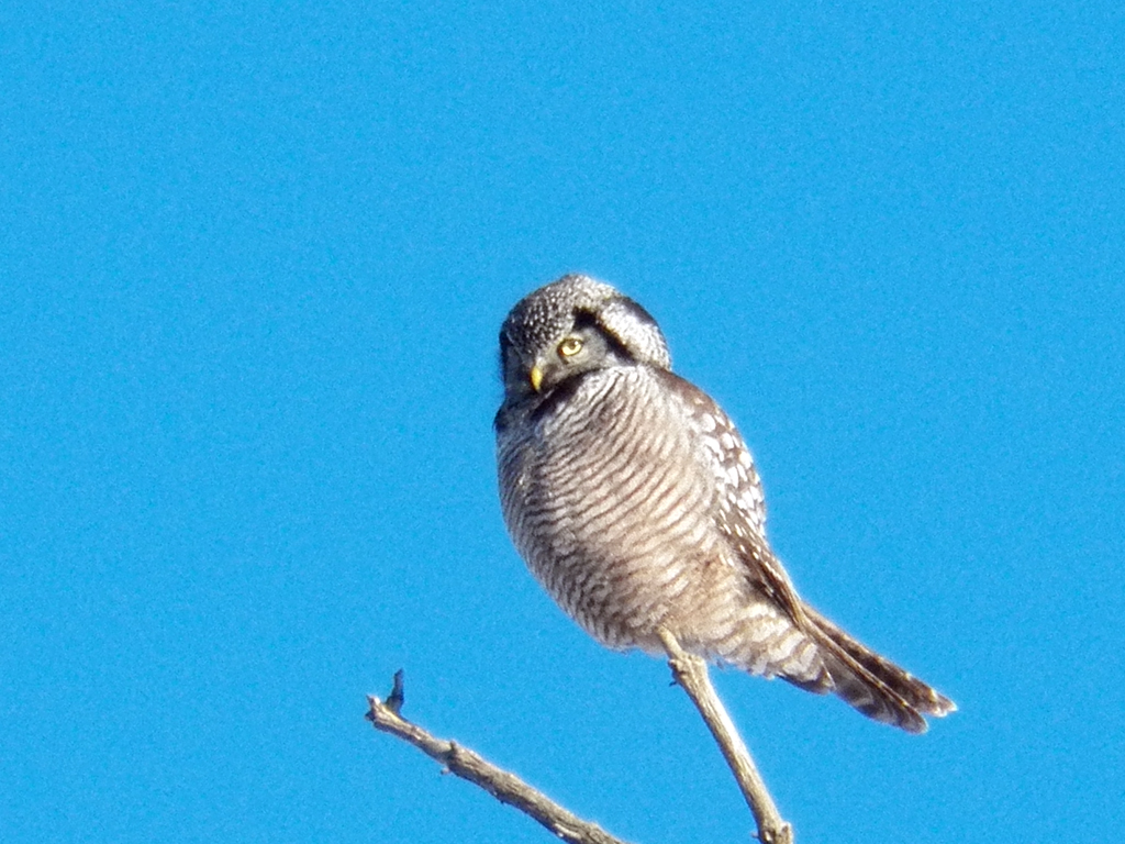 These owls are very tolerant of humans and it allowed us to take many photos and long binocular looks while it looked around and down at us, seemingly unconcerned about anything we were doing. Hawk owls are generally diurnal, and in aspect and behavior that can be almost kestrel-like. It was a really good way to end Superb Owl Sunday.