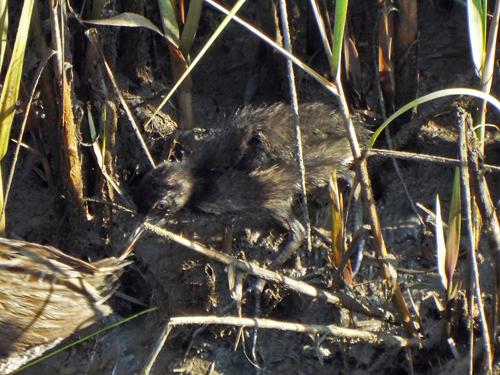 The adult rail had only one chick following it. I don’t know if that means only one survived or hatched, or if more chicks were with the other parent.