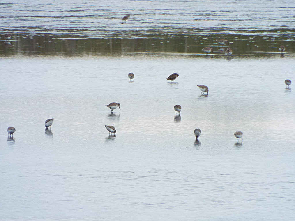 There were pockets of active shorebirds feeding all along the drive, including Killdeers, Long-billed Dowitchers, and what turned out to be a large flock of Dunlins on the mudflats, tucked away along a long path, on the other side of Boggy Pond [map]. The Dunlins were hanging out with some Semipalmated Plovers, yellowlegs and near a large number of gulls and terns.