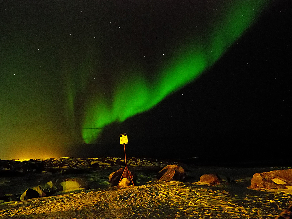 While we were in Churchill we had good aurora activity for 3 nights in a row! This was the first time either of us have seen the Northern Lights! There was a moderate geomagnetic storm this past week. Gail, whom we met at the B&B, is an “aurora hunter” and has traveled with her husband, Ben, to Iceland and Alaska to get good views. She helped me with some camera settings, and on the 3rd night of displays I tried my hand at some long exposure shots. [Note: Aurorae do not generally look this bright green to the unaided eye; the effect is more of a ghostly green – think “glow-in-the-dark” – but either way, they were breathtaking!]