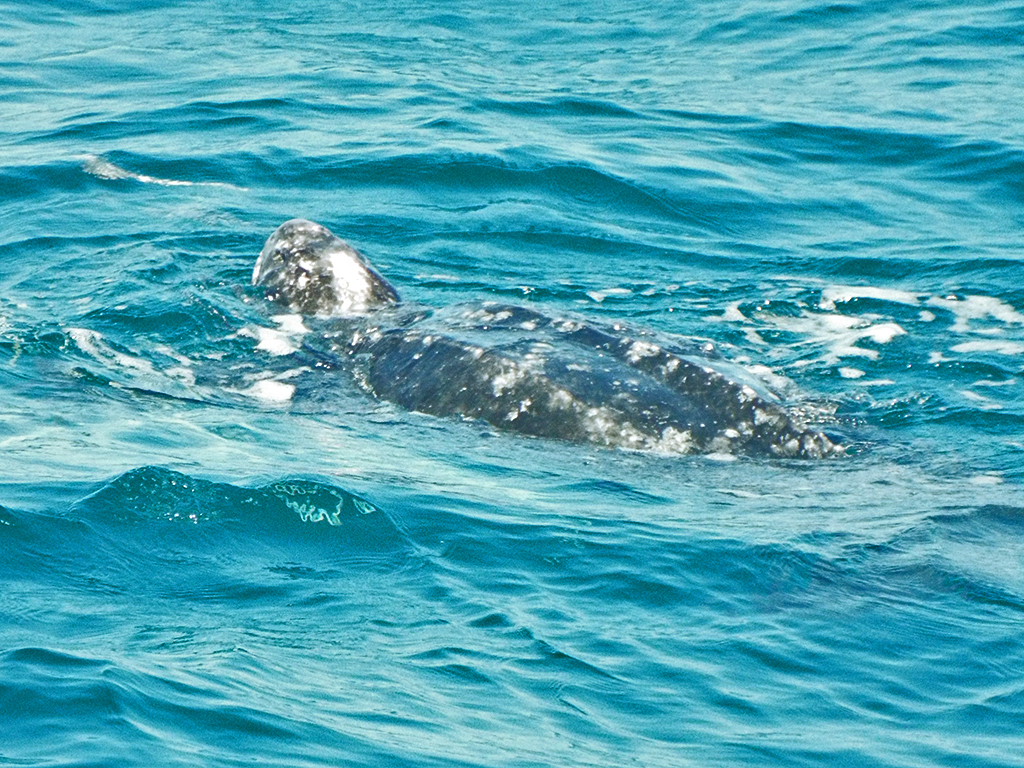 While scanning around for more shorebirds and perhaps some ducks hiding among the waders, Bella let out a small gasp and started to get excited about a couple of birds flying toward us. I swung my binoculars up to see something unexpected: two Snow Geese! And not only two, but one of each color morph: blue and white. They flew in a circle before settling down some distance away with some egrets and herons, behind a screen of vegetation.