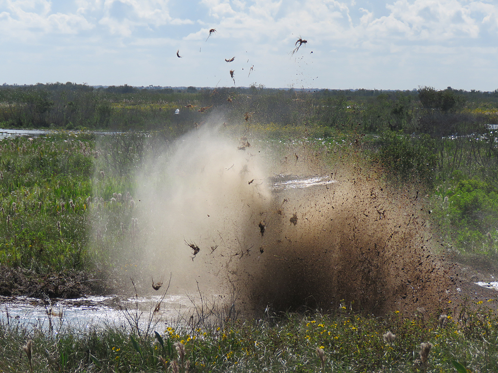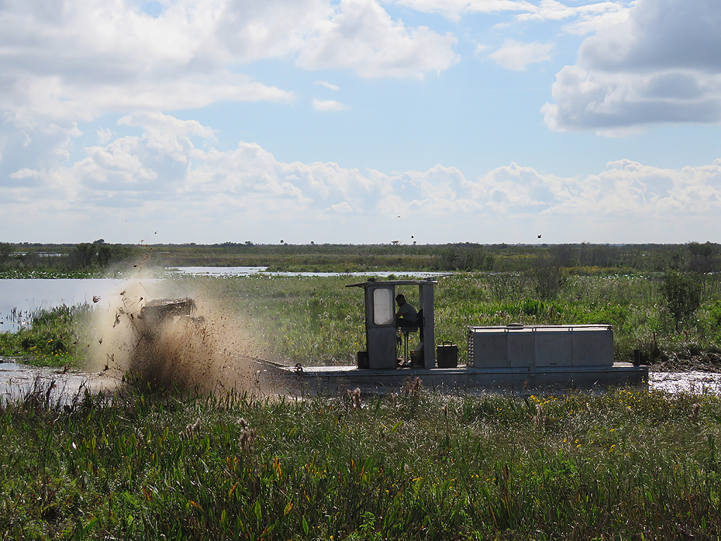 We also managed to encounter this frightening apparatus, used by the state to keep some of the waterways navigable for management (I’m guessing). This contraption appears to be a small boat with a pilot house on top and some jerry-rigged mounted whirl of menacing blades. It was slinging mud and roots into the air. Behind it, large groups of egrets were gathered, looking for whatever prey items (or parts thereof) it was stirring up. Sarah dubbed it… The Disturber.