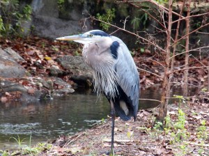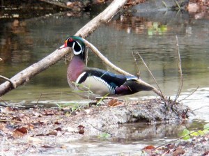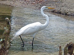 Further out on the creek, there was a pair of Wood Ducks, one male and one female. A Great Blue Heron was resting one one foot nearby. Shortly they were joined by a Great Egret that landed even closer to us and nervously stalked the creek among the cypress knees.