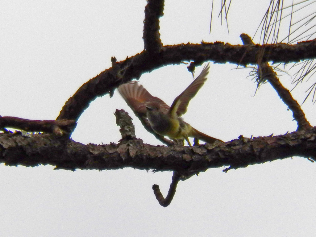 We had one last surprise before we left. Suddenly, right in front of us, an outburst of angry tweets and chittering came from one of the larger trees. Two Great Crested Flycatchers whirled into view, feet locked, spiralling down to the ground in a mini tornado of wings. They actually hit the ground before disengaging and flying off, calling out to each other.