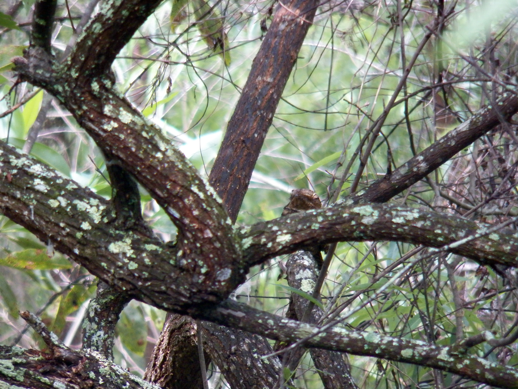 Camille and I decided to track back through the boardwalk to get another look at the Chuck-will’s-widow and eventually get back to the Barred Owl. On the way past the second viewing spot for the Chuck, we bumped into none other than Reinhard Geisler. We last saw Reinhard at the Orlando Wetlands, where he helpfully gave us a park map before shooing us out the door from his photography workshop. He was with a small group taking some photographs of the bird from the boardwalk. I asked if he had taken any “good shots” and he laughed and said, “depends on your definition of good.” The bird was in a tough spot to photograph from that vantage point. Camille and I decided to go down a path past the limb the Chuck was sitting on to both get a better photo, and to see more of the gardens. I went back and asked if everyone in the group with Reinhard had gotten a good look, because we intended to pass close to the bird, and we didn’t want anyone to miss out if it should flush and fly away. It seemed as if everyone agreed, so Camille and I proceeded. I managed to get a couple of decent close shots before the bird did indeed fly off to a new spot.