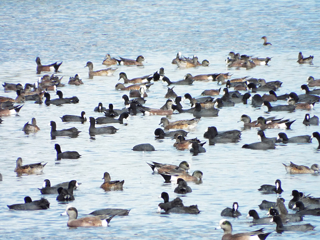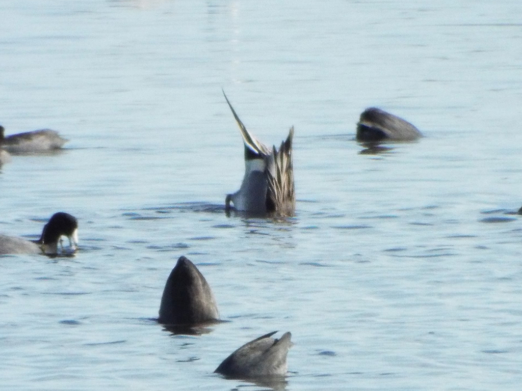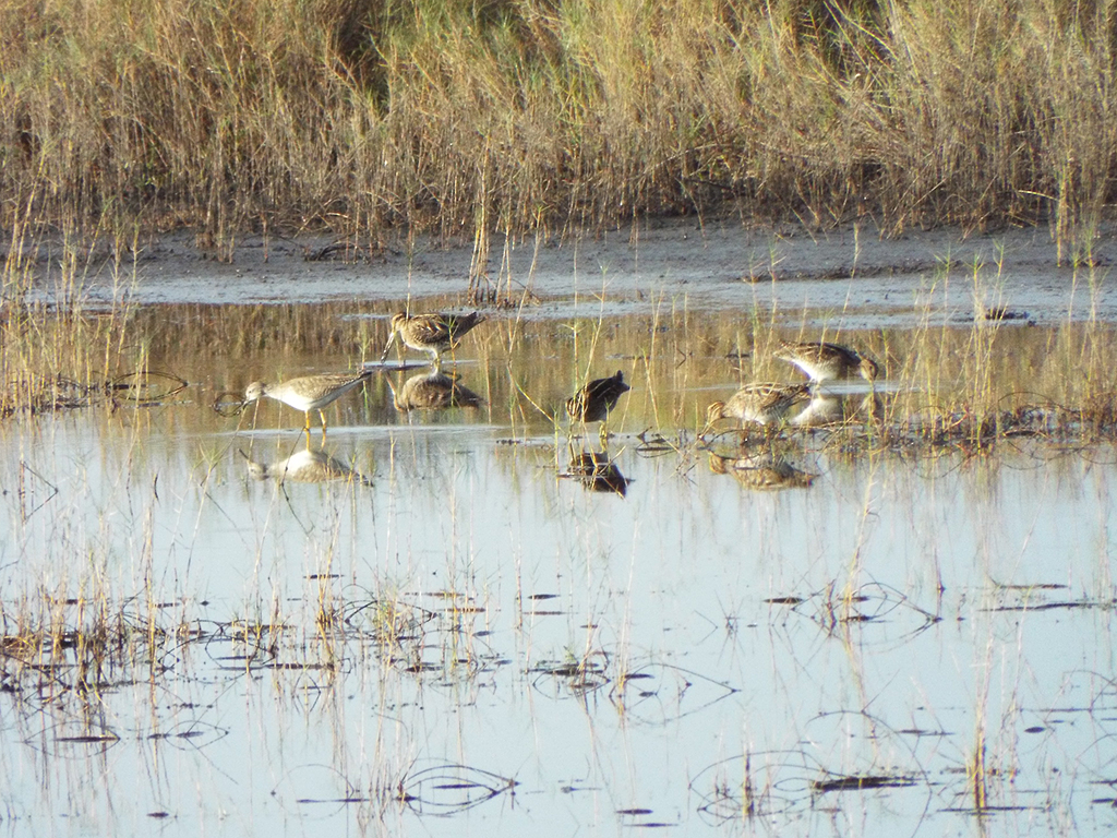 At first the birding was a little slow – the wind was really keeping the marsh birds out of the open. Eventually some shorebirds were seen feeding down on the leeward (downwind) sides of the dike road, including both Greater and Lesser Yellowlegs.