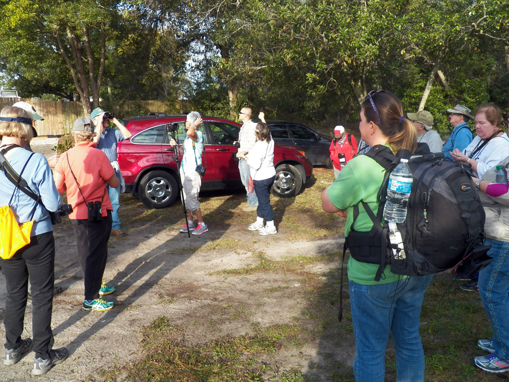 We braved another frigid (for Florida) and windy morning for the Waterfowl 101 field trip and workshop. The initial intent was to have about an hour or so of waterfowl description and identification tips, followed by a drive along Blackpoint Wildlife Drive [map] at Merritt Island to put some of that new knowledge into practice. While certain waterfowl, like Wood Ducks, Northern Shovelers, and Pintails, are easy to identify in the field (especially the males), other species can be trickier, and many of the females look very similar. I was hoping to get a little more help in duck identification. The weather had other plans. Since it was so cold and windy, it was decided we’d drive Blackpoint first, getting some of the tips and advice en route, then have the proper lecture at the end.