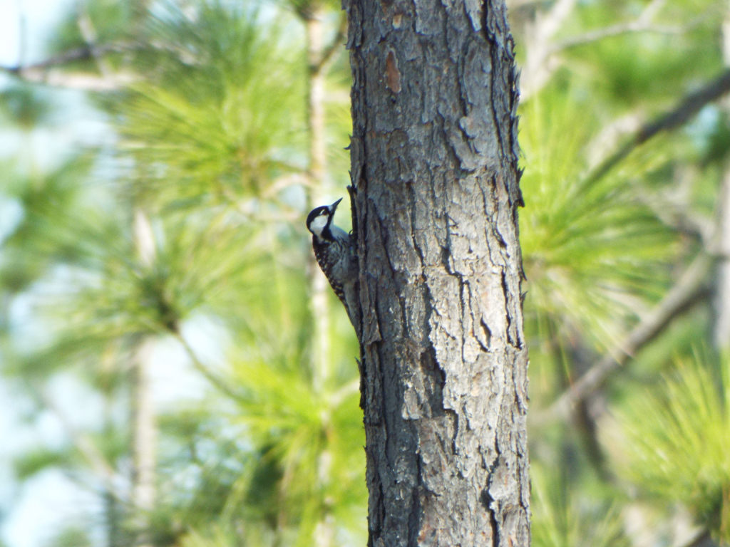 I was happy to have gotten 2 of the “big 3” to that point, but really wanted to get some decent photographs. As I walked along the “Red-cockaded Woodpecker Link” trail, I came across the various nesting trees, so marked with a white stripe.