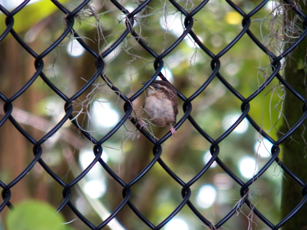 Baby Carolina Wren! The fence spacing here is much smaller than a standard chain-link fence, so this bird was small.